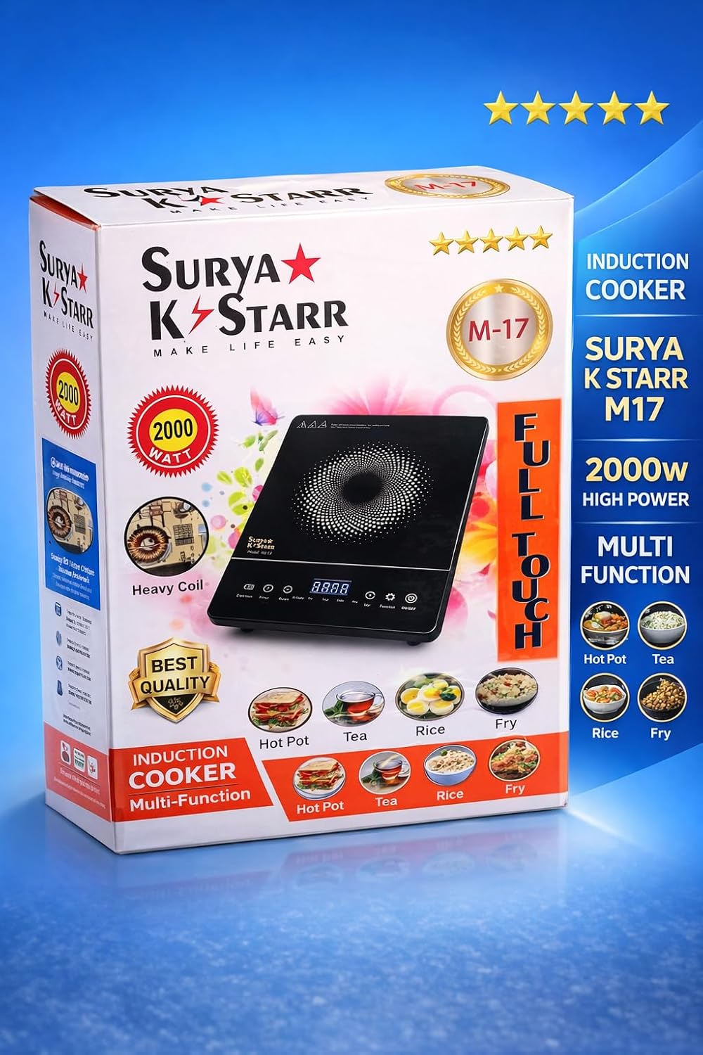 Upgrade your kitchen with the K-Starr Full Touch Induction Cooktop, a powerful and versatile cooking solution designed to make everyday cooking effortless. Equipped with advanced IGBT technology and a robust 2000W heavy coil, this induction stove delivers consistent, efficient heat for faster and more precise cooking. The sleek black glass surface features a smart digital display that allows you to monitor settings at a glance, while the full touch control panel offers intuitive operation for users of all skill levels. With multiple cooking functions built in — including options for curry, rice, fry, hot pot, milk, and more — this induction cooktop adapts to a wide variety of Indian and international recipes. The preset timer function lets you plan your meals with ease, ensuring perfectly cooked dishes every time. Its compact and portable design makes it ideal for home kitchens, hostels, and small spaces. The smooth, flat surface is easy to clean and maintain. Please avoid touching the surface immediately after cooking. Compatible with induction-ready cookware. A reliable and modern addition to any kitchen, this induction stove truly makes life easy.