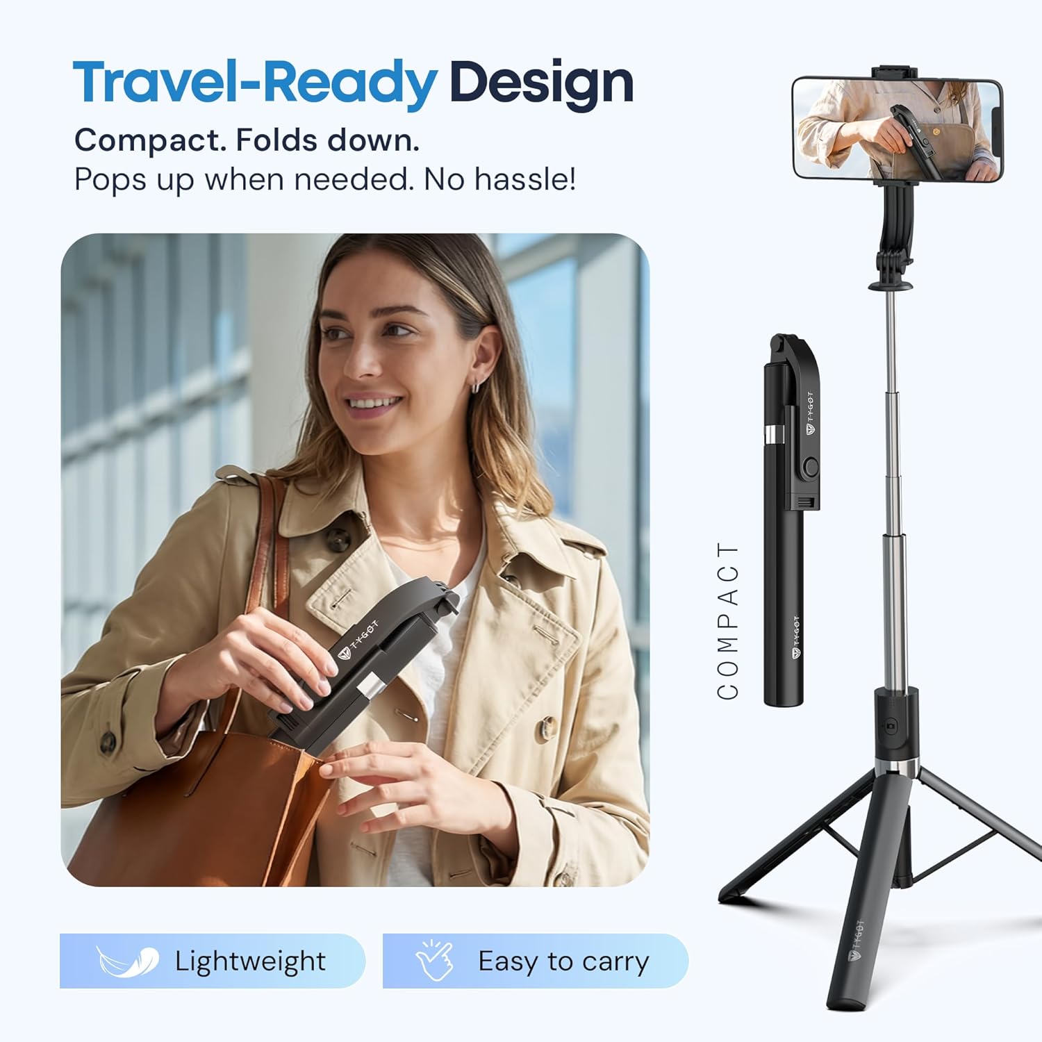 3-in-1 Multifunctional Design: The Tygot T9 Selfie Stick works as a selfie stick, tripod, and wireless Bluetooth remote, giving you the flexibility to switch between handheld and hands-free shooting with ease
