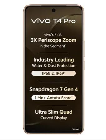 The Vivo T4 Pro 5G (Blaze Gold, 8 GB RAM + 128 GB) is a stylish and powerful mid-range smartphone designed for everyday use with standout features that make it feel premium. It sports a large 6.77-inch quad-curved AMOLED display with a smooth 120 Hz refresh rate and vivid colors, so videos, games, and photos look bright and immersive. Under the hood, it’s powered by the efficient Snapdragon 7 Gen 4 processor with Android 15 and Funtouch OS 15, giving you smooth performance for multitasking, streaming, and light gaming. Photography is strong too, thanks to a versatile triple camera setup with a 50 MP main lens and a 50 MP periscope telephoto camera, and a 32 MP front camera for crisp selfies. The phone houses a long-lasting 6500 mAh battery with 90 W fast charging, letting you go through a full day without worry. With dual-SIM 5G support, in-display fingerprint sensor, and a sleek Blaze Gold finish, this phone blends performance, style, and solid battery life in one complete package.